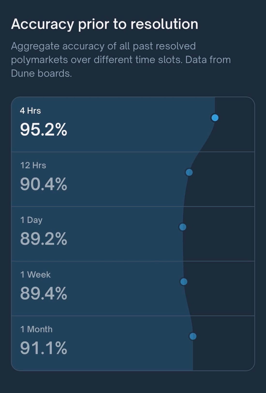 He's not wrong. Traditional polling has hovered around 60-70% accuracy for decades. Nate Silver's FiveThirtyEight, considered the gold standard of election forecasting, topped out around 75-80% in good years. Polymarket is now consistently maintaining accuracy rates above 90% across timeframes from four hours to one month, with 95.2% at the four-hour mark representing something closer to precognition than prediction.