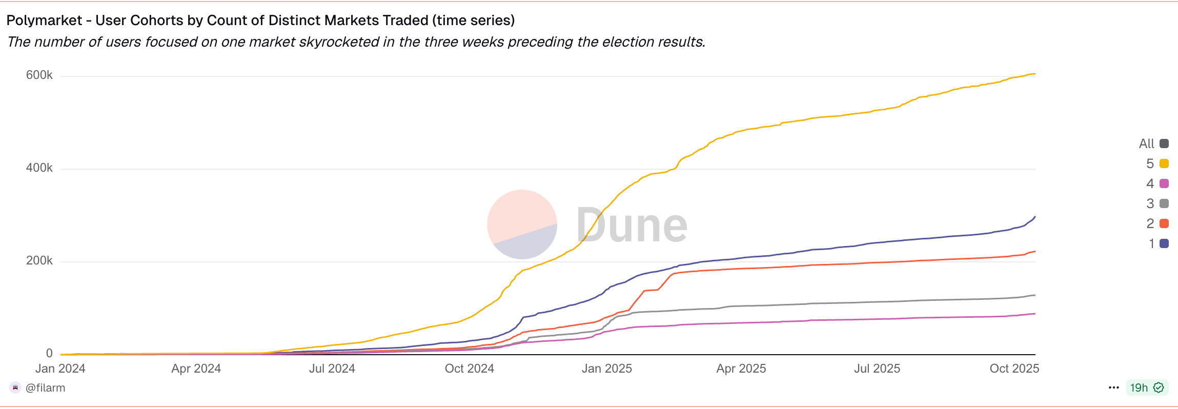User behavior shows sticky engagement. The number of users focused on single markets skyrocketed in the three weeks before election results, which makes sense. But users trading across five or more markets grew consistently throughout 2024 and continue growing post-election. People aren't leaving. They're diversifying into other prediction topics.