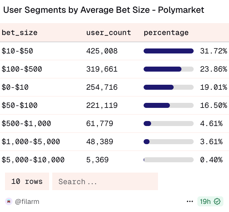 The user segmentation confirms this. 31.72% of users bet between $10-$50. Another 23.86% bet $100-$500. Only 0.40% bet $5,000-$10,000. This looks like mass adoption to me.