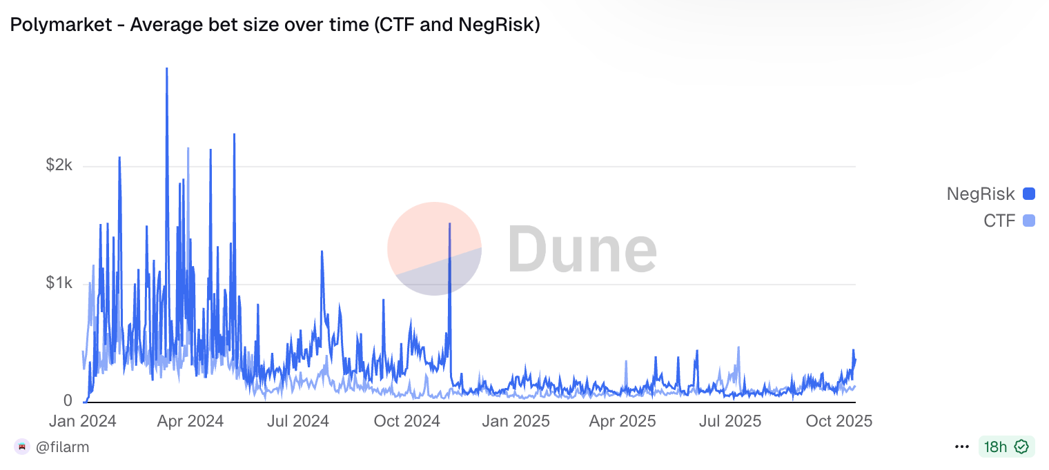 Average bet size has been steadily decreasing for CTF markets while remaining volatile for NegRisk markets. This suggests platform democratization. Early adopters were crypto-native whales making large bets. Now it's regular people making smaller, more frequent predictions across diverse topics.