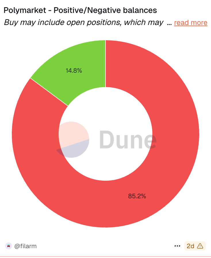 Now for the uncomfortable truth: 85.2% of Polymarket users are currently in negative balance. Only 14.8% are positive. That's 1,146,902 wallets underwater versus 198,788 profitable.