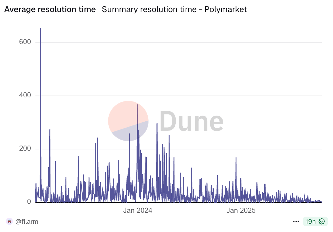 Resolution times have been dropping dramatically. Average resolution time is now 17 days, median is 4 days, with a standard deviation of 38 days. This suggests two things: more short-term markets are being created as users look for frequent opportunities to speculate, and the infrastructure for resolving markets is getting faster and more efficient.