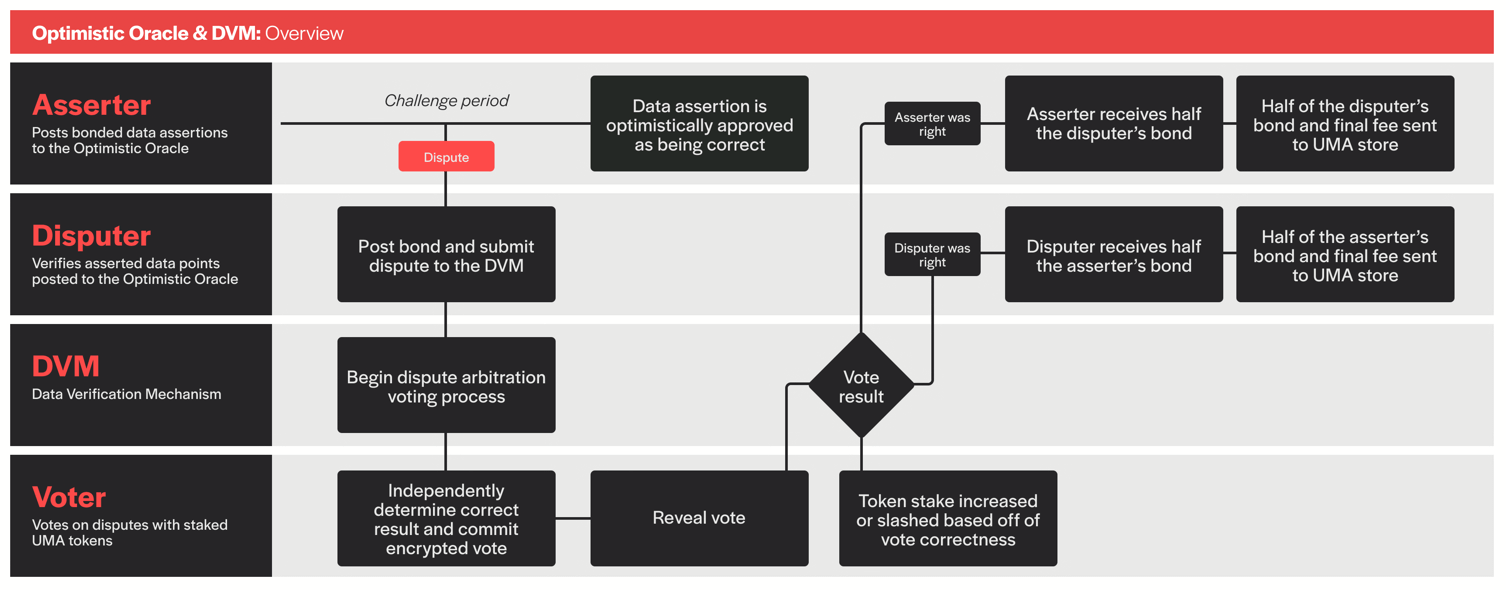If someone disputes the assertion, it escalates to UMA's Data Verification Mechanism (DVM), where UMA token holders vote on the correct outcome. The DVM vote concludes after 48-96 hours. Voters reference off-chain price feeds and methodologies defined in the market's UMIP (UMA Improvement Proposal) to determine ground truth.